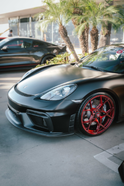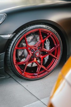 Also being displayed for 2026 is the Project 6GR CL series. (Center lock) The Porsche Cayman GT4 is wearing our latest model finished in candy apple red with red center lock accents. The wheels are crafted from forged T6061 Aerospace grade aluminum and designed to showcase a center lock look but with the functionality of a traditional 5 lug application.