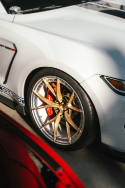 Also new for 2026 is the Project 6GR 2 piece forged series. On display on the magnetic grey GT350 we have the Project 6GR 10L model finished in satin black center with gloss black lip and burnt titanium mounting hardware. The wheels measure 19×11 front and 19×11.5 rear and are wrapped with Michelin Pilot Sport 42 tires. The two piece construction allows us to build in any width and diameter configuration. Also allows the client to fine tune their custom set with finish and different mounting hardware options.