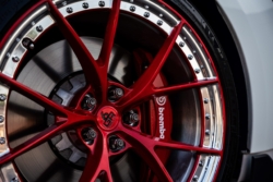For the White/Blue they were able to shave nearly 200LBS off of the vehicle with just carbon fiber parts. The front brakes were swapped over to Carbon Ceramic Rotors resulting in big rotational weight savings. The vehicle has a one piece carbon fiber driveshaft and all exterior trim was replaced with dry carbon fiber parts. The carbon doesn’t stop there, the Hood, Trunk and Doors are carbon. The carbon was painted giving it a uniform look but for the hood and trunk the stripes portion was left unpainted to show the blue tint exposed carbon. The vehicle is lowered on Eibach lowering springs giving it that beautiful stance. All of these carbon fiber parts resulted in big weight saving making the car out perform similar power GT350Rs.
